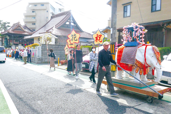 お釈迦(しゃか)さまの誕生日は4月8日とされ、生誕を祝う花まつりがかつてはあちこちで行われていましたが、社会情勢の変化で減ってきています。しかし真光寺では花まつりが続けられています。本堂で法要を済ませた後は、白象を先頭に稚児行列が町へ繰り出しました。今から70年ほど前に稚児の一人として町を歩いた私は、当時の記憶がよみがえりました。