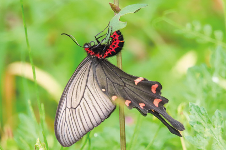 毒々しいまでの赤と黒のまだら模様の腹部を、アクロバティックな姿勢でウマノスズクサに押し付けて産卵するジャコウアゲハが目に入りました。幼虫の餌になるウマノスズクサが激減し、希少なアゲハチョウとなりました。
