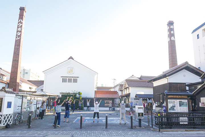 西条駅前地区のラジオ体操が、今年から歴史広場になったと聞いたので出掛けました。開始時間の6時30分に行くと、会場の周りの背の高い酒蔵のおかげで、朝日を浴びることなく涼しく体操できました。体操中には2本のれんが煙突が目に飛び込んできます。日本全国には無数のラジオ体操会場がありますが、酒蔵通りの歴史公園は他ではあまりない場所ではないかと思います。