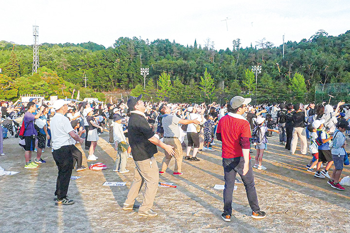 竹とんぼを飛ばして新記録に挑戦するイベントが行われました。主催は東西条住民自治協議会で、会場は東西条小学校のグラウンドです。夕日がかすかに差し込む、撮影にはぎりぎりの光線下で一斉に飛ばしました。竹とんぼが飛んでいる時間は一瞬で、肉眼でははっきり見えませんでしたが、写真を拡大してみると、竹製のとんぼが夕日を浴びてオレンジ色に変身して乱舞していました。主催者発表で「741人が飛ばしたので、念願の新記録達成です」とアナウンスがありました。