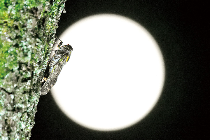 7月21日、梅雨明けの発表があり気温も33.5度まであがりました。セミたちも一気に合唱し始め、私の昼寝の邪魔をします。夜は満月、特等席で月見をしているニイニイゼミを見つけました。セミの背景に月が昇るのを待って、望遠レンズをのぞきながら一緒に月見を楽しみました。セミが止まっていたのが高い場所で、照明が届かずほとんどシルエットになってしまいました。