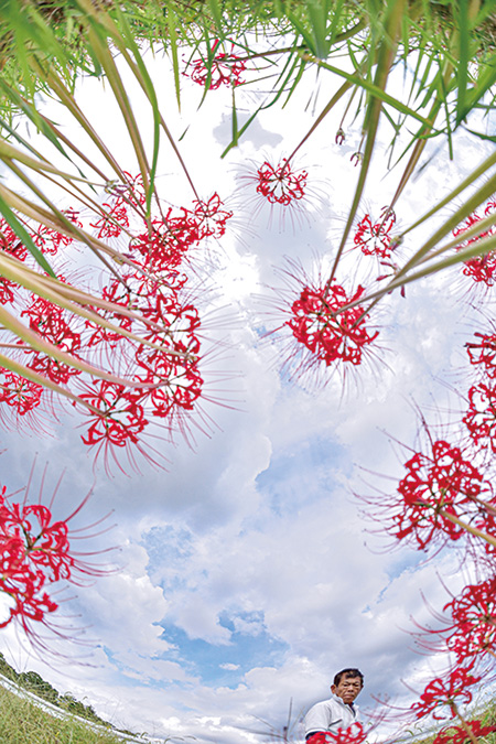 9月21日ごろから一気に秋めきました。今年は猛暑で各地の彼岸花の開花が遅れ、彼岸が過ぎて見ごろを迎えました。八本松町の戸石川に沿って続く稲刈り前の田んぼは、赤く縁どられたあぜに囲まれ鮮やかな田園風景が見られます。