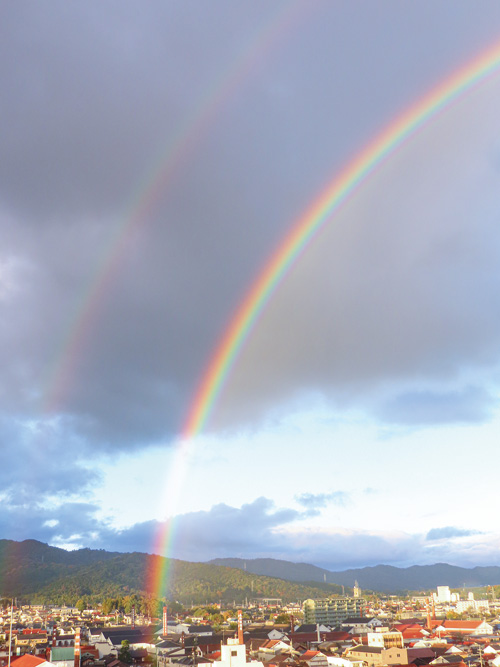 日没前、西条町の北の空に虹が出現。初めは短冊状だったので、撮影する気にもなれず眺めていましたが、突然右方向に伸びて完全な虹となったため、慌てて家に帰ってカメラで撮影しました。この虹はがとても鮮明で副虹さえ現れました。虹の根元にはレンガ煙突が林立しており、虹は煙突から昇っているかのように見えました。
