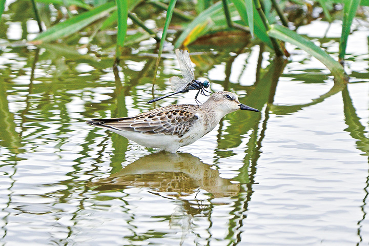 トウネンはスズメ大くらいの大きさで、シギの仲間。東南アジア、オーストラリア、ニュージーランドにかけての地域で越冬します。また、日本に立ち寄って休憩やエネルギー補給をする旅鳥です。情報をもらって3日ほどの滞在、群れで飛来しますが今回は1羽でした。採餌に夢中なトウネンの背中に一瞬シオカラトンボが止まり、トウネンもびっくりした表情で振り向いています。野鳥にトンボがとまった珍しい写真が撮れました。小さな鳥が数千㌔の長旅するのには驚きます。