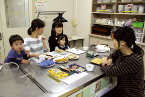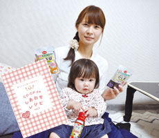 三永に住む長谷川さんは三世代で生協を利用している組合員。子どもが小さいので、買い物時にかさばるトイレットペーパーやティッシュペーパーなどの日用品のラインナップがうれしいと話す。「種類豊富なカタログにある食品はどれもおいしく、商品によっては魚の骨が取られているので安心。小さな子どもがいる家庭には離乳食のレシピも配布されるので、便利」と笑顔。