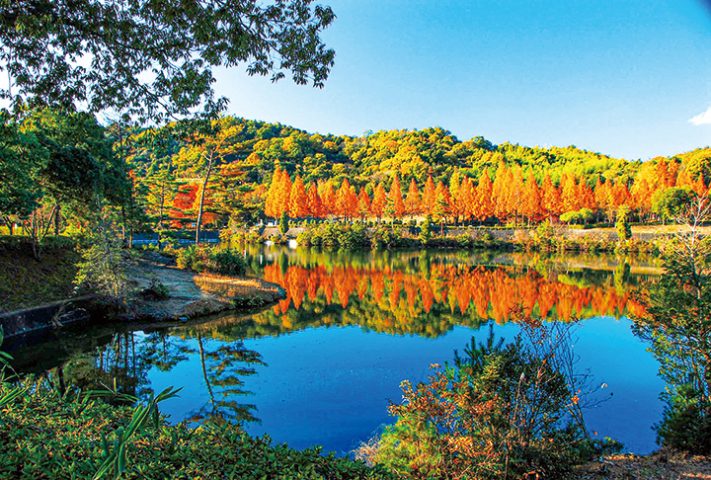 鏡山城跡の麓に整備された緑豊かな公園。モミジやカエデなど約400本の紅葉が楽しめる。池に映る紅葉の景色は幻想的で美しい。見頃は9月下旬~11月中旬。