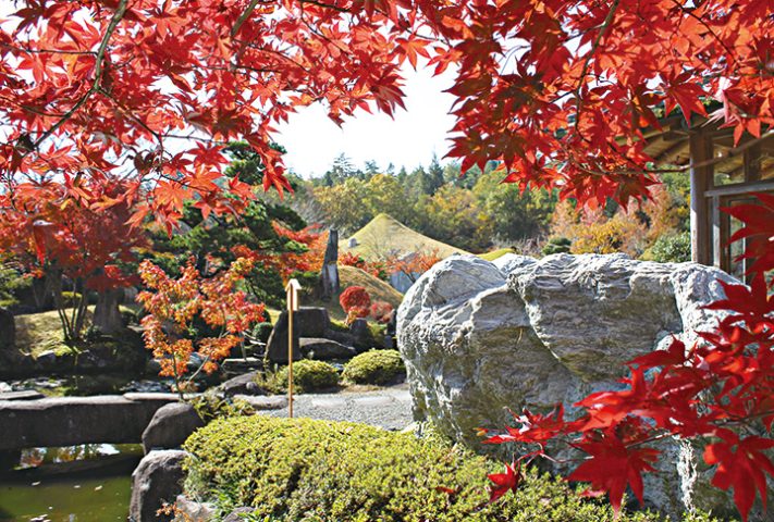 全国の銘石、奇石、組石が観賞できる大規模石庭。石と紅葉の調和が素晴らしい。モミジ、カエデ、ドウダンツツジ、アメリカフウなどが楽しめる。見頃は10月下旬~11月中旬。