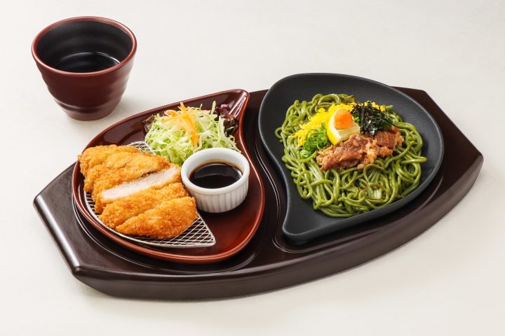 三元豚のロースとんかつと、山口県を代表するソウルフードの瓦そば風に熱々の鉄板で仕上げた茶そばのセット。