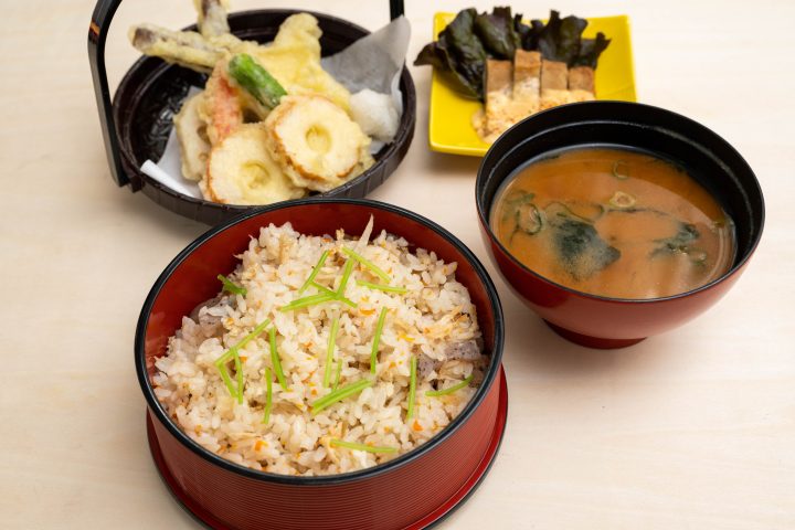 「鞆の浦をイメージした御膳。福山の海産加工品メーカー「阿藻珍味」監修の鯛飯、じゃこ天、鯛ちくわを用した上品な味わいをぜひご賞味ください。