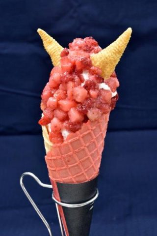 桃太郎伝説に因んで赤鬼をイメージして作成したオリジナルソフトです。角をだしいちごダイスをトッピングして強い鬼をイメージしました。ぜひ、ご賞味ください。