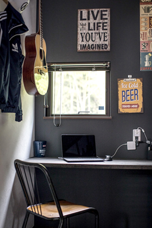 「変更したのはキッチン周りのカスタマイズ、クロスや照明のセレクト。何より、多趣味の夫婦が愛用する家具や小物たちがBinOの住宅に彩を加えます。理想のマイホームを実現するためにもお客さんひとり一人に寄り添い、提案していきます」と日興ホームの担当者。