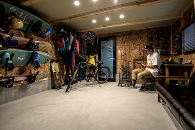 半地下に設けられた洋室は、隠れ家や秘密基地のようなプライベート感を満喫できる。遊び心が詰まったアウトドアストッカーと呼ばれるガレージは、まさに夫婦のライススタイルが見えてくるような空間。自転車やボード、釣り道具などが並び、ガレージの外にはステンレスのミニキッチンも確保。釣った魚を料理しながらガレージの回りでバーベキューパーティーも楽しめる。