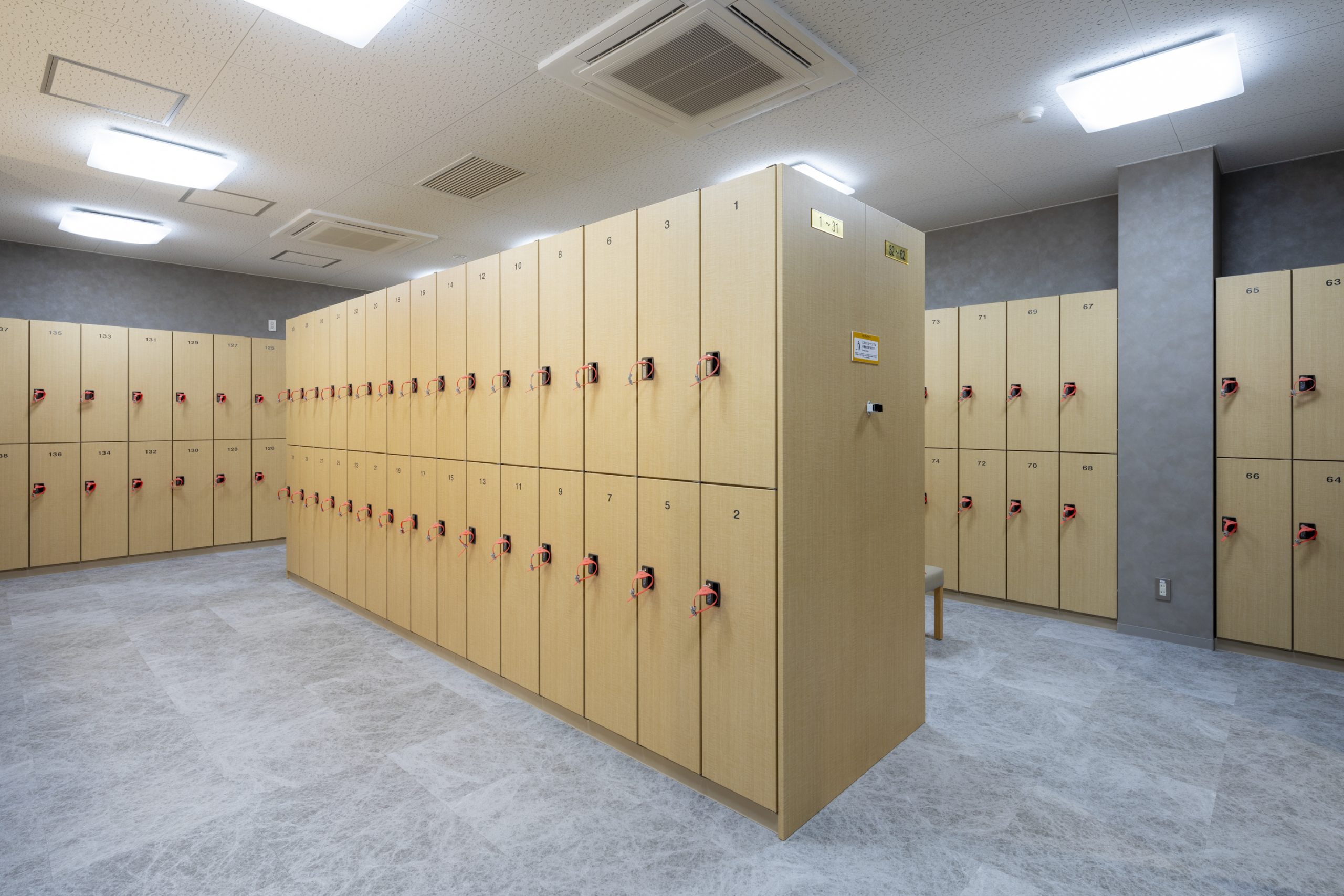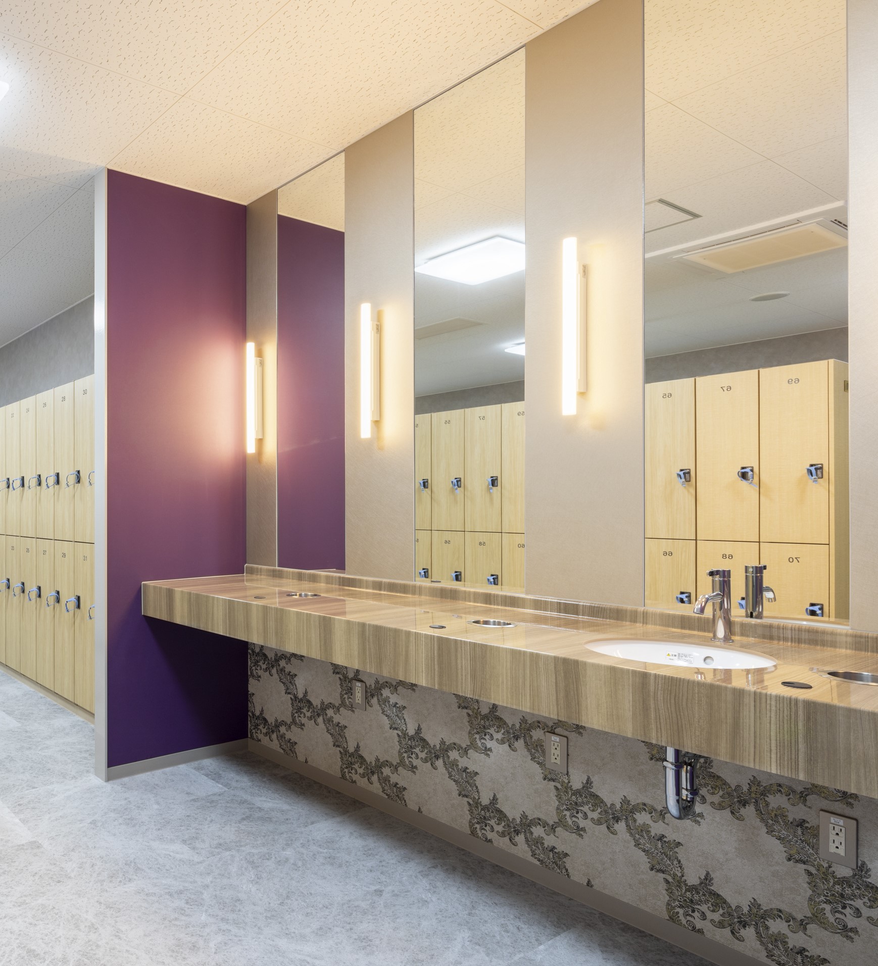 女性更衣室です。広くてロッカーの数も多いですよ。洗面台の鏡にはライトもついていました。