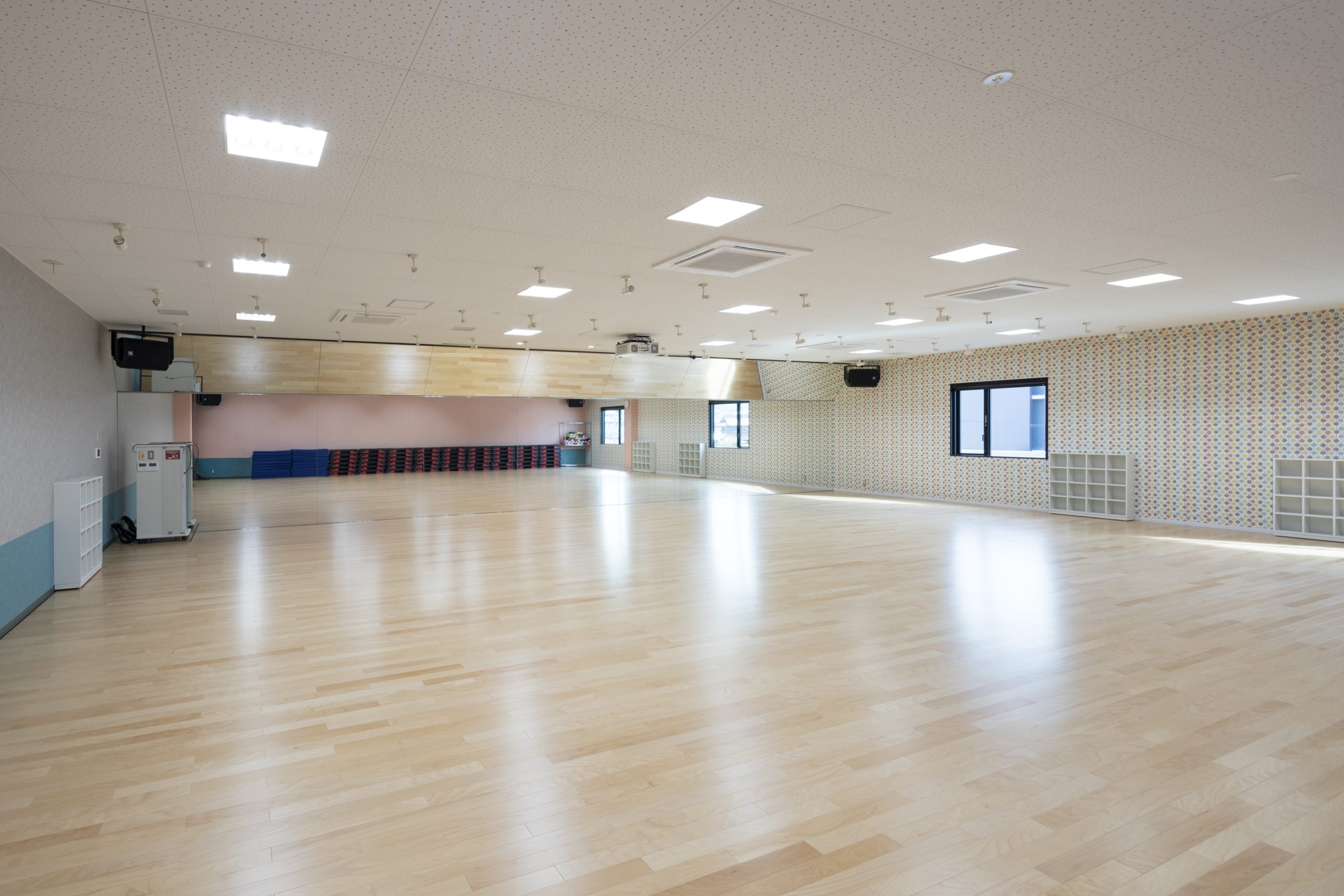 スタジオの様子。100人は入れるそうです。部屋にはヨガマットなども置いてありました。