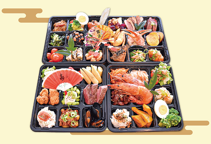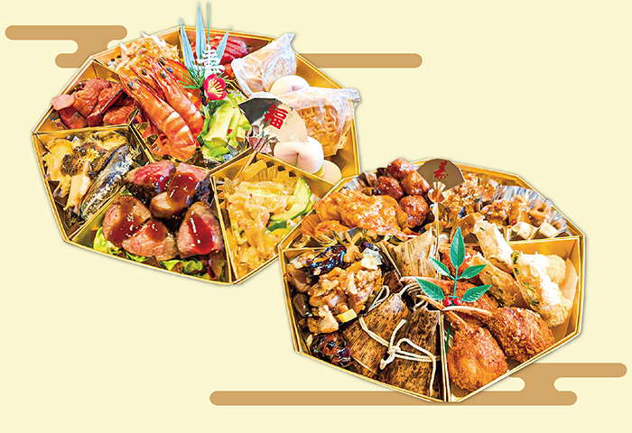 揚(あ)げた鶏肉(とりにく)を四川唐辛子(しせんとうがらし)と花椒(かしょう)※1で炒(いた)めた辣子鶏※2や、もち米を竹の葉で包んで蒸したちまきが入った中華おせち。二段重ねで盛りだくさん!