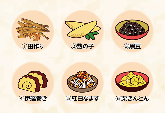 カタクチイワシの稚魚(ちぎょ)を干(ほ)した「ごまめ」を使う料理。フライパンで軽く炒(い)って香ばしさを出し、しょうゆ・みりん・砂糖で甘辛(あまがら)く煮詰(につ)めます。