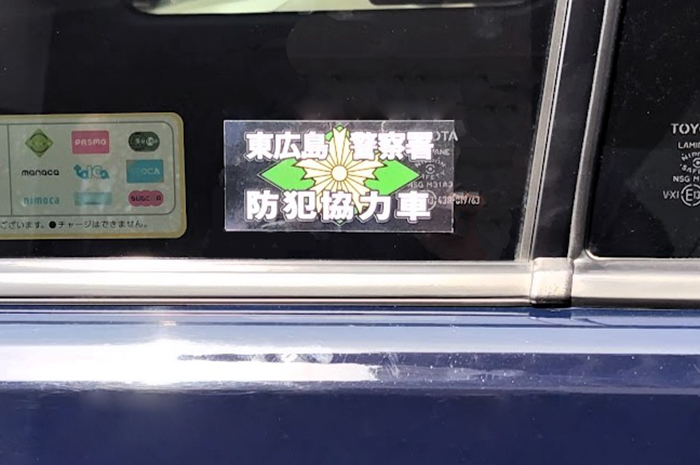 この後、「東広島警察署防犯協力車」と記された同ステッカー(横9・0㌢、縦4・3㌢)を乗客が乗車する助手席側後部座席のガラス窓に貼り付けた。同ステッカーは、700枚作成。市内を走る14社のタクシー約250台に順次貼り付ける。