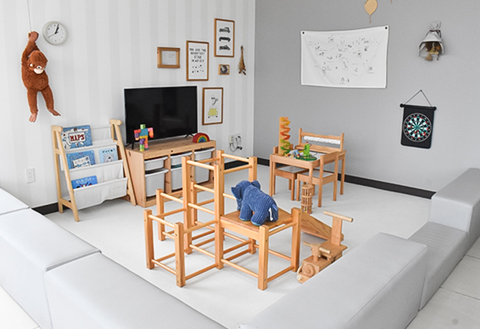 カーイノベーションと共同のキッズスペースもあります。木のジムやおもちゃがたくさん。洋服を選んでいる間、子どもを遊ばすことができます。