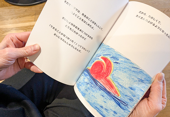 三つの難病を抱えた吉川さんのこれまでの経験や家族の思いを、二人の子ども目線で描いています。水が苦手だったけど水泳に挑戦したことなどが、やわらかい言葉とタッチで表現されています。
