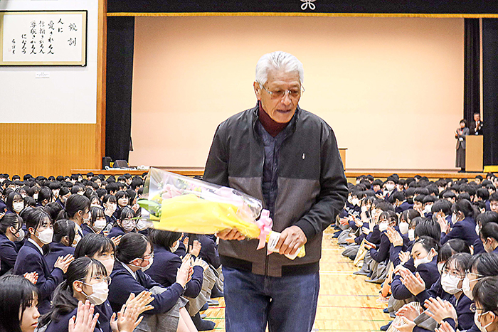 感謝状の贈呈式では、生徒ら約1000人を前に、橋本校長が「雨の日も風の日も休むことなく生徒たちを交通事故などから守り続けてもらった」と謝辞を述べ、大田さんに感謝状と記念品を贈った。