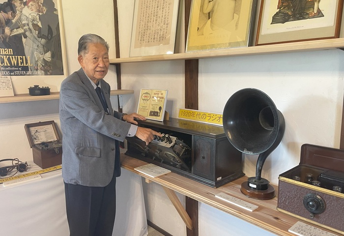 ラジオ博物館は、昨年7月にオープンした古民家カフェの隣にある納屋を活用。1階は修理工房で 1960年以降、近代のラジカセ、CDラジカセ、DVD、デジタルオーディオ、無線機、携帯電話、旧式テレックスなど約80点を展示。2階には、社友会・本部の荒川泰蔵さん(86)が18年間のアメリカやイギリス勤務時代も含め、半生をかけて収集した世界の貴重なアンティーク品が並ぶ。1920~1950年代の鉱石ラジオや当時の部品、真空管式ラジオ、スピーカー、蓄音機など約40点の貴重なコレクションを展示している。