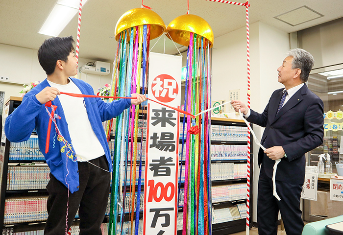 100万人目の来場者となった県立賀茂高3年の中西脩一郎さんは「高3になって受験勉強で週5日通っている。センターは、集中して勉強できて疲れたら本を読むなど気持ちの切り替えができる。明日は受験なので頑張って勉強したい」と笑顔だった。新谷センター長は「多くの人に利用してもらいうれしい。これからも、児童青少年の居場所となるように努めていきたい」と話していた。