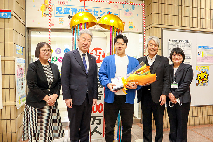東広島市立児童青少年センター(同市西条西本町、新谷三平センター長)の累計来場者数が1月25日、開館から24年目で100万人を突破し同センターで記念セレモニーが行われた。