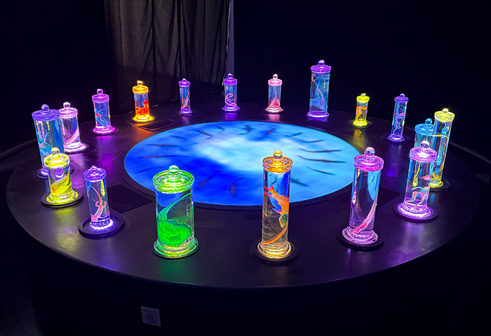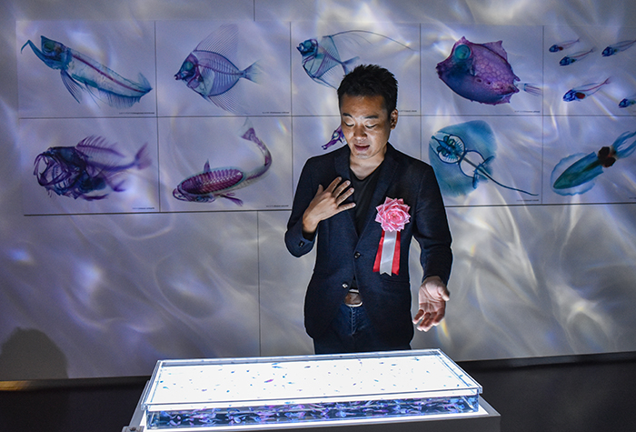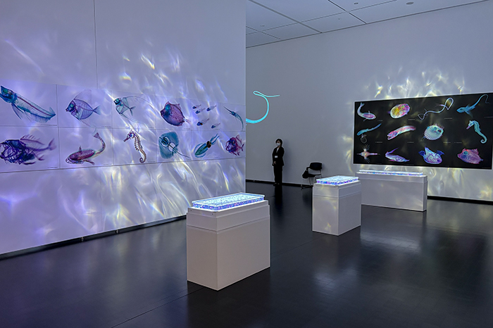 会場では、魚類を中心に約500点の透明骨格標本を展示。学術的に解説したパネル付きの標本展示エリアや、標本をライトアップし幻想的な映像演出によるアートエリアがあり、終盤には、音・映像・光の共演が織りなす約4分間の「ライティングショー」を展開。