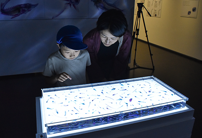 多彩な光に照らされた標本が神秘的な音楽とともに浮かび上がる展示手法に、来館者の一人は「生き物の体の構造が目に見てよく分かり、生物の触覚なども染まっていて面白く、印象的だった」と話していた。