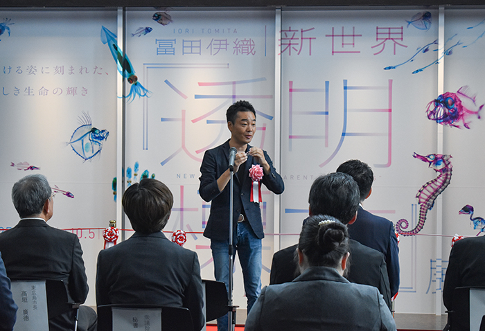 7月10日に行われた開会式で、冨田さんは「標本の上からと横から鑑賞がおすすめ。多くの人に生き物の造形を感じていただき、生き物ってすごいと思っていただけるとうれしい」と目を細めていた。