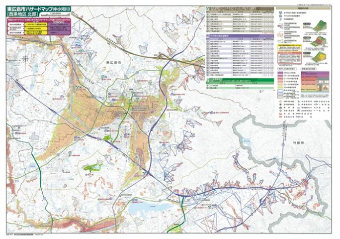 東広島市が作成したハザードマップは、100年に一度程度の雨が降った際の土砂災害の危険区域や河川の氾濫による浸水想定区域を示した冊子と、2015年の法改正で「1000年に1回」級の降雨が被害想定に加わった区域を示したリーフレット(A2判)がある。