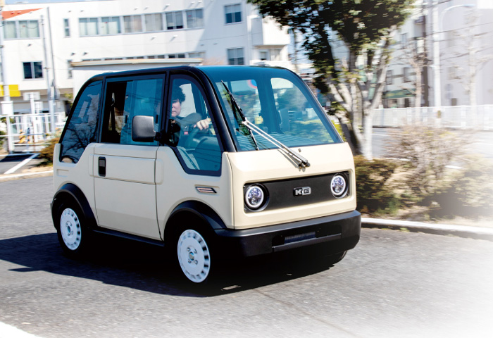 東広島市西大沢のKGモーターズは、小型電気自動車の「mibot(ミボット)」を開発・製造しているよ。一人乗りで、狭い道もスイスイ。開発した人はミボットを「モビリティロボット」と位置付けて、将来の移動がより便利に、より楽しくなるよう、さまざまな工夫をしているんだ。