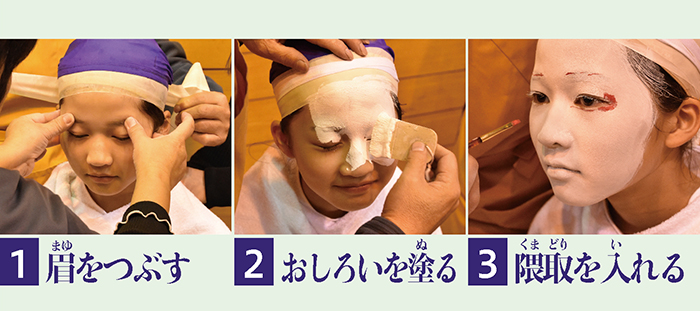 油や粉、刷毛(はけ)などを使います。道具も方法も、現代の化粧(けしょう)と違いますね。