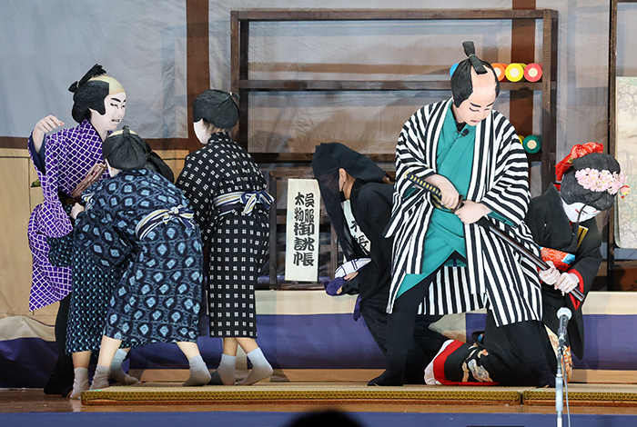 今年は11月30日、市立高屋東小学校で開かれました。演目は、5人の盗賊が活躍する「白浪五人男(しらなみごにんおとこ)」。この演目の「稲瀬川(いなせがわ)勢揃いの場」を大人、「浜松屋店先の場」を子どもが演じました。子どもの部には高屋東小の児童を中心に、小中学生11人が出演。