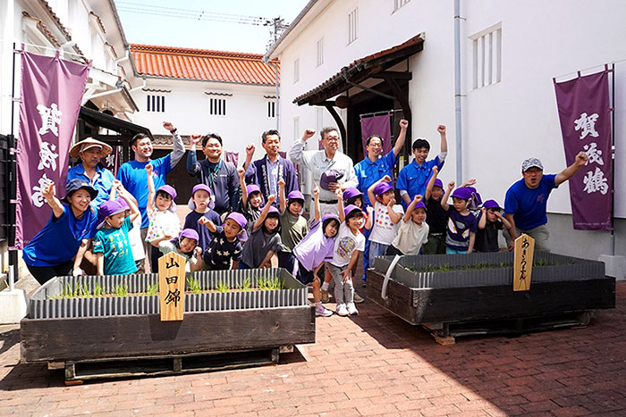 賀茂鶴酒造株式会社は5月20日、見学施設の一号蔵直営店前の敷地内に設置した田んぼ3基で、園児による田植え体験会を実施しました。