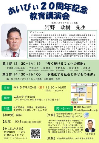 開校以来お世話になっている河野政樹先生(虹の子どもクリニック院長)をお招きし、教育講演会を行います。