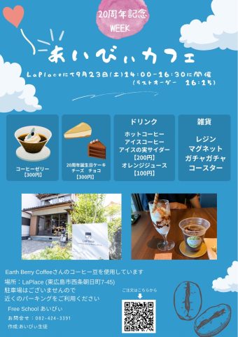 東広島市西条昭和町にあるFree School あいびぃが9月19日~24日、20周年記念WEEKを開催します。気になるイベント情報を東広島デジタル編集部がお知らせします。