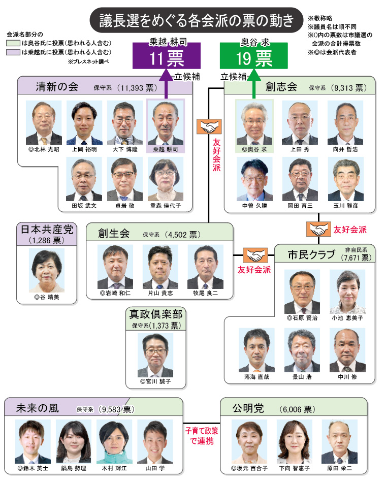 奥谷氏は、所属する創志会(6人)と友好会派の創生会(3人)、市民クラブ(5人)に加え、公明党(3人)などから支持を受け、7人の最大会派から出馬、議長返り咲きを狙った乗越氏を大きく引き離した。