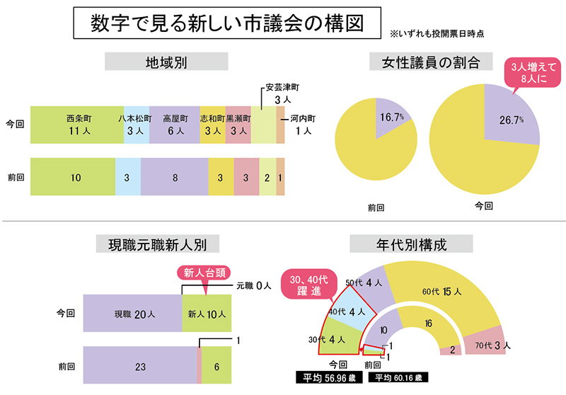 東広島市議会(定数30)は5月10日、改選後初の臨時会を開き、議長に奥谷求氏(64)(創志会)、副議長に岩崎和仁氏(56)(創生会)を選んだ。議長選は、奥谷氏と、元議長の乗越耕司氏(67)(清新の会)が立候補。30人が無記名で投票し、奥谷氏19票、乗越氏11票で、奥谷氏に決まった。新しい会派の構成と合わせ、議長選をめぐる動きを文と図でまとめた。(日川)