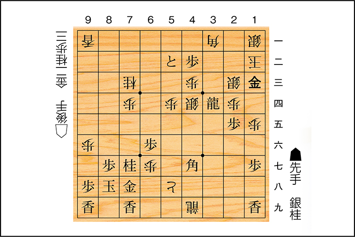先手玉は☖7六桂からの詰めろで、後手玉は詰まらない局面。