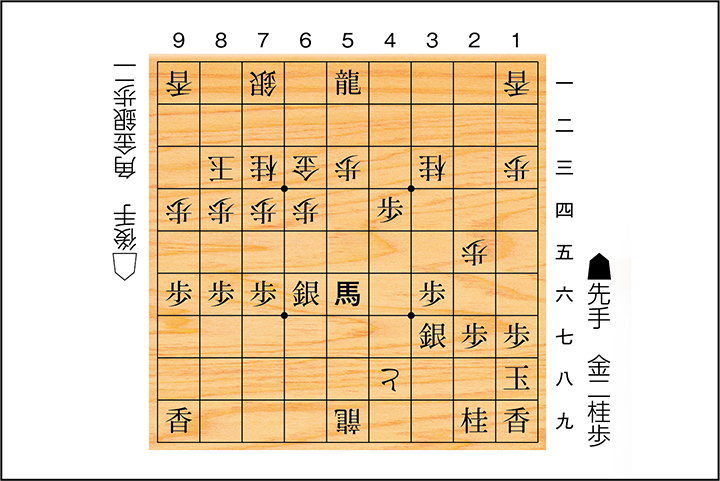 相振りの飛車の終盤戦。先手の☗5一龍に後手が☖5九飛成と迫った局面。☗5六馬が攻防手で、1手を稼ぐ正解手となる。