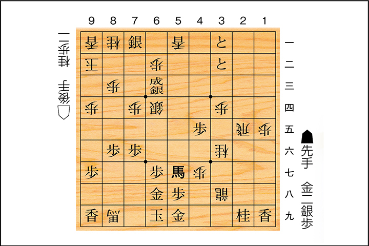 居飛車対振り飛車の終盤戦。先手の☗7一銀に後手が☖9二玉とかわした局面。