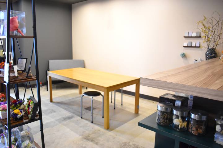 店内の販売スペースの隣にあるイベントブースでは、フラワーアレンジメント教室やコラボイベントを実施するそうです。