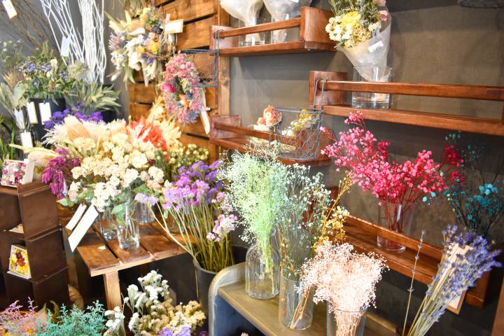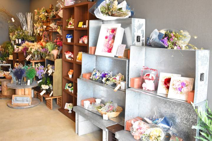 プリザーブドフラワーとドライフラワーが並ぶ店内