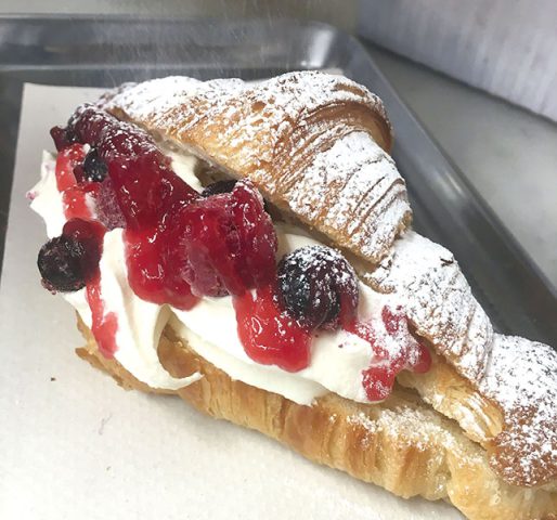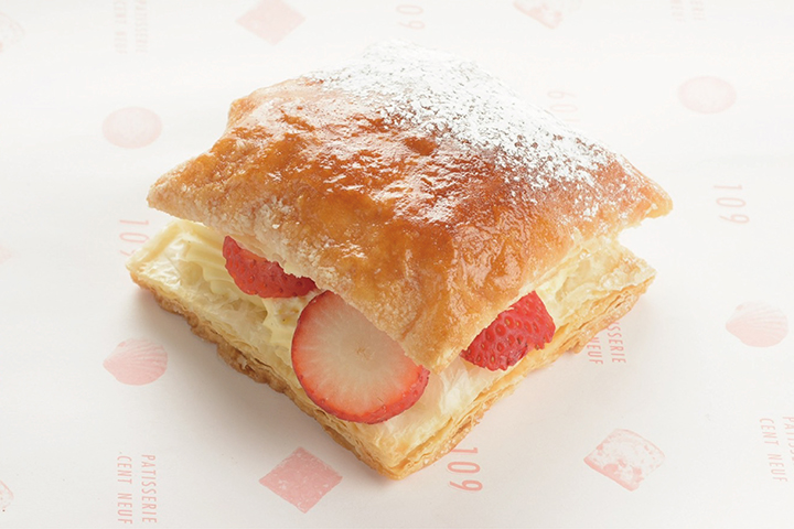 バターが香るサクサクパイに自家製カスタードを絞りサンドした片手で食べるミルフィーユです。セゾンには季節のフルーツをサンドしています。セゾンは税込346円。