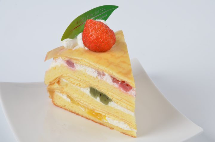 卵の風味豊かなクレープ皮とサンドしたクリームの口どけの良さとフルーツ感の組み合わせの良さが感じられます。苺とマンゴー、キウイの色とりどりのフルーツを使い華やかに仕上げました。
