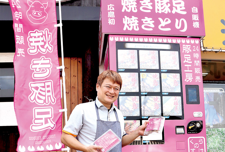ホットカモ(東広島市西条町御薗宇)では、お風呂上がりのお客さんをターゲットに、姉妹店豚足工房くらのすけの自動販売機を設置。