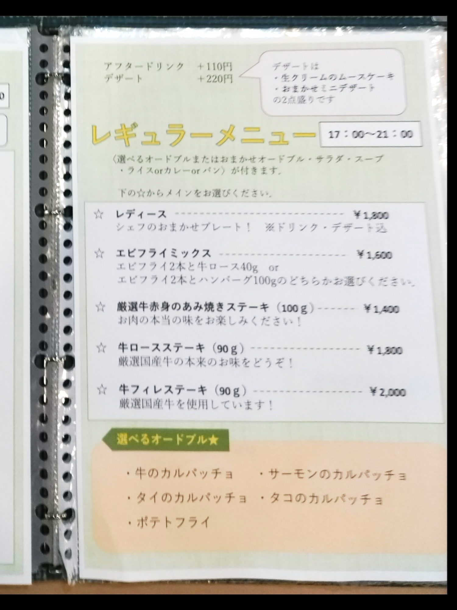 おまかせオードブル、サラダ、スープ、ライス or カレー or パン
