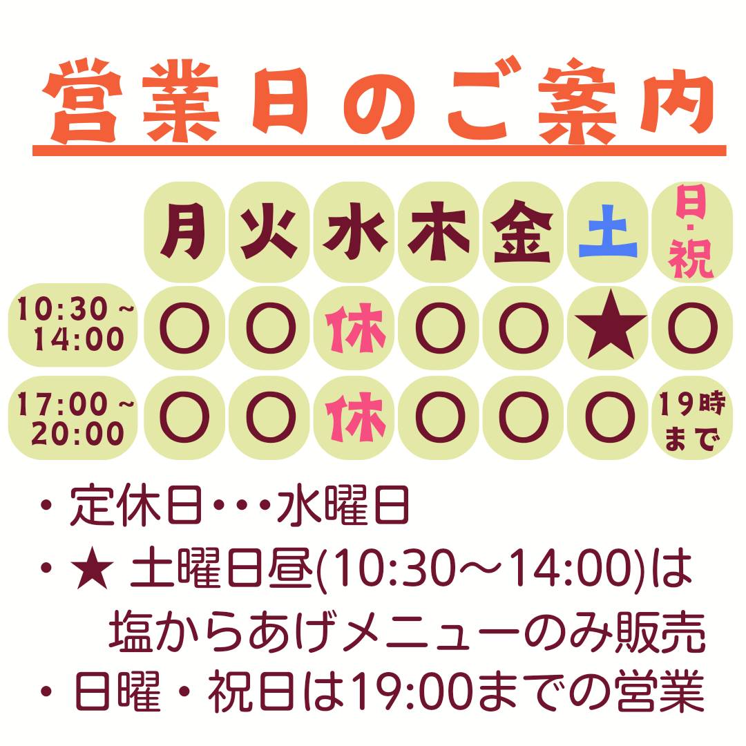| 営業時間 | 10:30~14:00 17:00~20:00 土曜日は塩からあげメニューのみ 日曜・祝日は19時までの営業 |