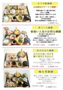 刺身・天ぷら・煮物・茶碗蒸し・旬の素材料理など